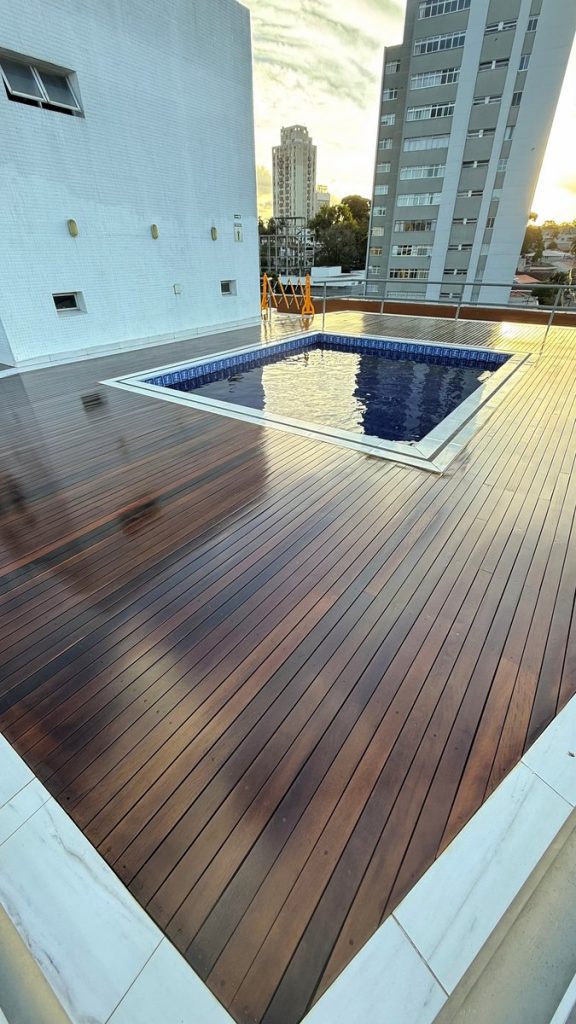 O resultado é um deck nivelado, bonito e pronto para receber acabamento com verniz ou resina de longa duração.