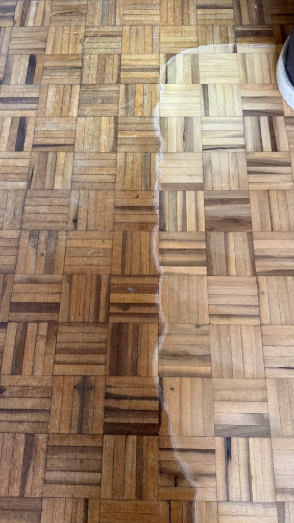Após o lixamento, o piso pode receber Synteko, cera ou verniz, conforme o resultado desejado.